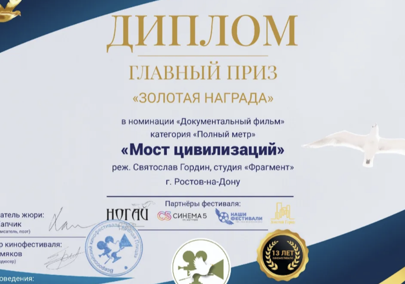 Документальная картина режиссера Святослава Гордина «Мост цивилизаций» получила главный приз Всероссийского кинофестиваля «Белая птица», который проходил в Казани 21–22 февраля 2026 года.